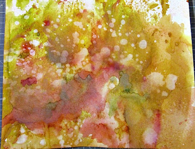 Empiezo trabajando sobre una cartulina blanca, aplico sobre el matt tres tintas oxide la fired brick, peeled paint y fossilized ambar, pulverizo y voy pasando la cartulina sobre el, impregnando la cartulina, seco con el secador y si es necesario repito el proceso pero ya aplicando los colores por separado y secando entre aplicación y aplicación. Para acabar salpico con agua y paso el papel de cocina. Y este es el resultado después de secar.